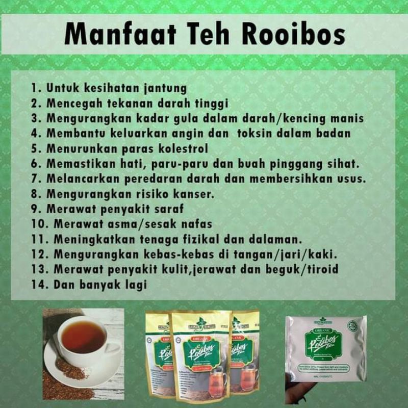 Sebuah studi menunjukkan teh rooibos mulai menghambat enzim tersebut 30-60 menit setelah diminum. Dilansir BBC GoodFood teh rooibos telah dikonsumsi di daerah pegunungan Cedarberg di Afrika Selatan selama lebih dari 300 tahunTanaman rooibos Aspalathus linearis ini pertama kali dicatat oleh ahli botani pada. Ditanam dan tumbuh secara organik untuk kesegaran mutu yang lebih baik.
